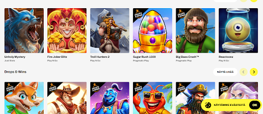 Käyttöliittymä: Navigointi on intuitiivista ja suosituimmat pelikategoriat löytyvät helposti.