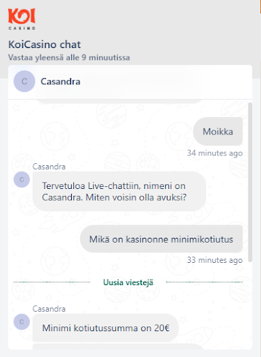Kyllä. Koi Casinon asiakaspalvelu palvelee suomen kielellä päivittäin kello 10–24. Muina aikoina apua on saatavilla englanniksi livechatin kautta ympäri vuorokauden.