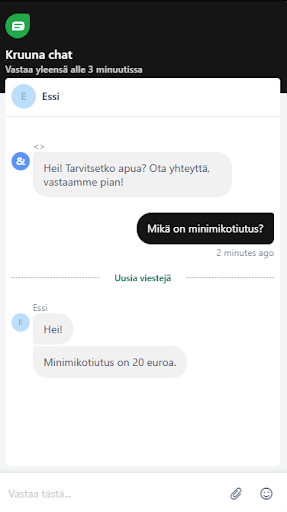Live-chat: Asiakaspalvelussa Essi niminen henkilö vastasi meille kysymykseemme alle minuutissa ja saimme myös jatkokysymyksiin nopeasti avun.