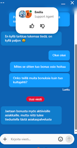 Livechat: nopein kanava ongelmiin ja kysymyksiin. Pelaajat raportoivat yleensä nopeista vastauksista chatissa, jolloin yksinkertaiset asiat (esim. talletus- tai bonuskysymykset) hoituvat minuuteissa.