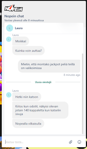 Live-chat: Testasin live-chatia kysymällä jättipottipelien määrää. Sain vastauksen 3 minuutissa, ja asiakaspalvelija osasi vastata kysymykseeni selkeästi.