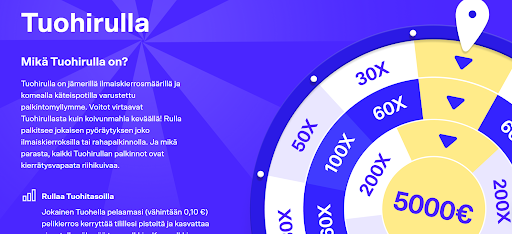 Ensimmäisen kerran pääsin pyöräyttämään Tuohirullaa tallettamalla vähintään 10 euroa. Pyöräytys on täysin sattumanvarainen, ja Bonuksena 0-600 käteiskierrosta tai jopa 5 000 euron käteispalkinnon. Kaikki palkinnot ovat täysin kierrätysvapaita.
