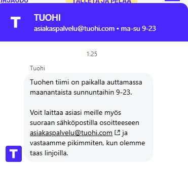 - Sähköposti: Sähköpostia voi lähettää osoitteeseen asiakaspalvelu@tuohi.com. Testissäni vastaus tuli muutaman tunnin sisällä, mikä on ihan hyväksyttävää.