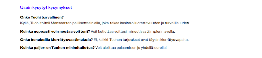 Sivustolta löytyy UKK-osio, jossa on vastaukset yleisimpiin kysymyksiin. Kävin sen läpi ja sieltä löytyi apua perusasioihin kuten talletuksiin ja nostoihin. Visuaalisia oppaita tai videoita en löytänyt, mikä olisi voinut helpottaa uusien pelaajien perehtymistä.