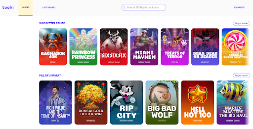Tuohi Casinon pelivalikoima on kattava. Testasin sivustoa useaan otteeseen ja löysin sieltä sekä kolikkopeleja, live-pelejä että pöytäpelejä.