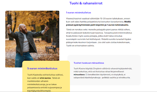 Miniminostosumma on sama 5 euroa, joten talletukseen verratuna minimikotiutus on 10 kertainen. Tämä johdonmukaisuus on mukavaa, sillä monella kasinolla talletus voi olla pieni mutta nosto vaatii huomattavasti suuremman summan. Tuohi ei leiki tällaisia temppuja, vaan pitää rajat selkeinä ja reiluina.